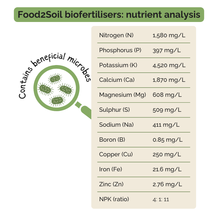Unlike standard fertilisers, Food2Soil biofertilisers contain all the nutrients plants need to thrive PLUS a robust community of alive fungi and bacteria. These microbes build soil structure and health, and help plants absorb nutrients more efficiently.
